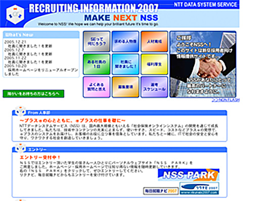 NTT DATA SERVICE リクルートページです。小さいボタンのマウスオーバーによって右にあるビジュアルを切り替える技術が流行っていました。