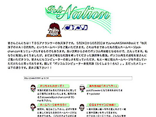 TBSアナウンサー 秋沢淳子さんの個人サイトを制作しました。友人ということもあって崩しすぎのきらいはある似顔絵をGIFアニメにして当時は珍しかった動くホームページにしました。