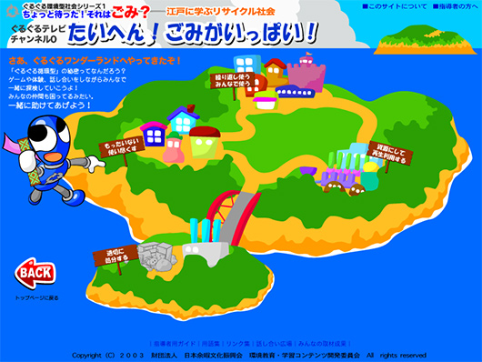 中学生向けのリサイクル教育サイトぐるぐるテレビチャンネル0。トップページにはマウスオーバーでアクション、うちページにはFLASHと動画で楽しく学べるようにしました。